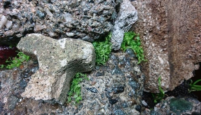 コブラグラスは手前側の小さなコンクリ片の周りに点在するように植えて、グリーンとコンクリのコントラストを出す狙いです。